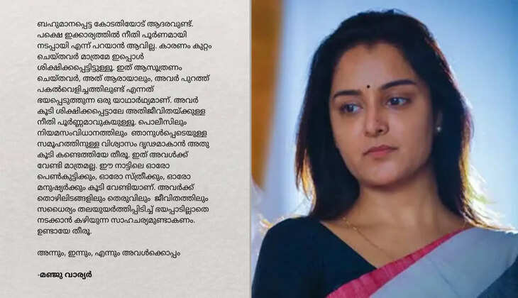 നടിയെ ആക്രമിച്ച കേസിൽ നീതി നടപ്പായില്ലെന്നും കുറ്റം ചെയ്തവർ മാത്രമാണ് ശിക്ഷിക്കപ്പെട്ടതെന്നും മഞ്ജു വാര്യർ. ആസൂത്രണം ചെയ്തവർ ആരായാലും അവർ പുറത്ത് പകൽ വെളിച്ചത്തിലുണ്ടെന്നത് ഭയപ്പെടുത്തുന്ന യാഥാർഥ്യമാണെന്നും സാമൂഹിക മാധ്യമത്തിൽ പങ്കുവെച്ച പോസ്റ്റിൽ മഞ്ജു വാര്യർ പറയുന്നു. അവർ കൂടി ശിക്ഷിക്കപ്പെട്ടാൽ മാത്രമേ അതിജീവിതയ്ക്കുള്ള നീതി പൂർണമാവുകയുള്ളൂ എന്നും മഞ്ജു പ്രതികരിച്ചു.
