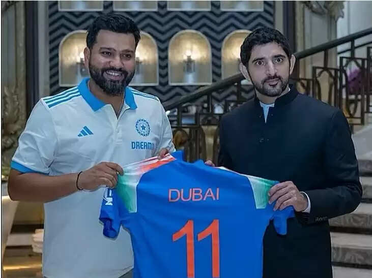 തുടർന്ന്, 'ദുബൈ'യും നമ്പർ 11ഉം എഴുതിയ ടീം ഇന്ത്യ ജേഴ്സിയിൽ ഒപ്പിട്ട്, രോഹിത് ശർമ്മയോടൊപ്പം ജേഴ്സി കൈയിൽ പിടിച്ച് ഫോട്ടോഗ്രാഫർമാർക്ക് പൊസ് ചെയ്തു.