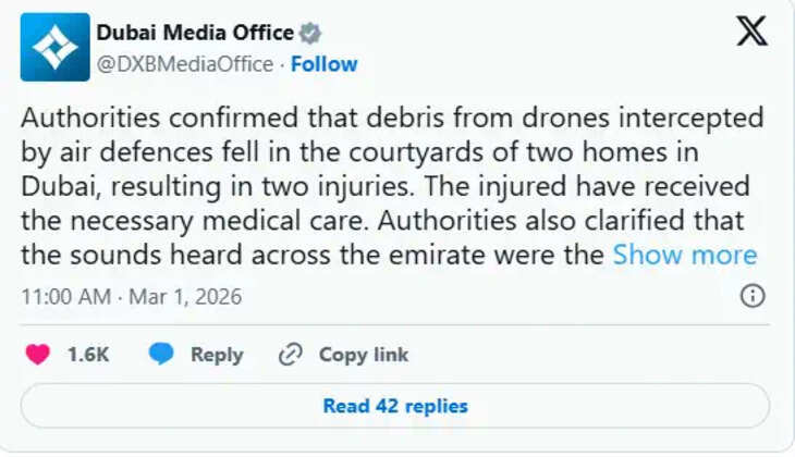 ദുബായിൽ ഡ്രോൺ അവശിഷ്ടങ്ങൾ വീണ് 2 പേർക്ക് പരുക്ക്, വീണത് 2 വീടുകളുടെ വീട്ടുമുറ്റത്ത്