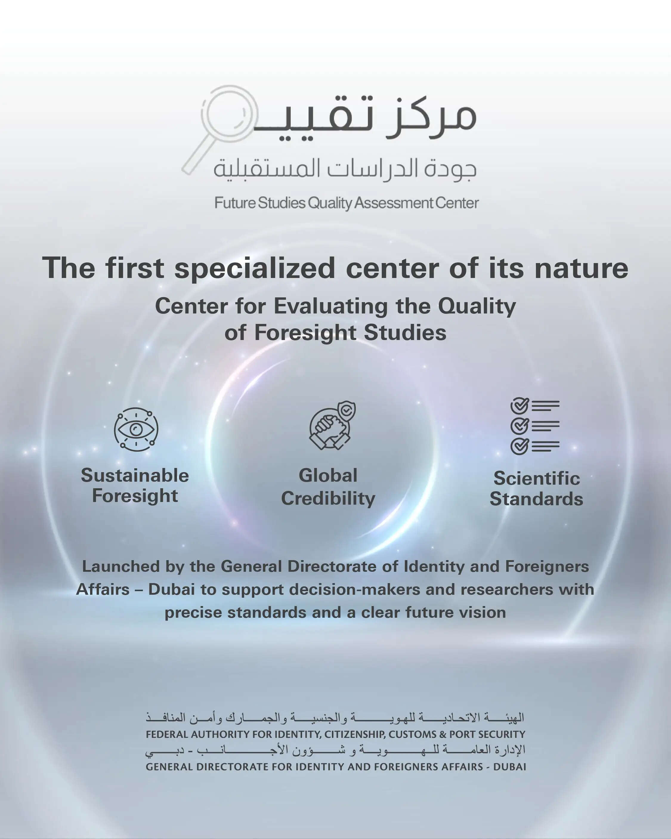 ദുബായ്:ഭാവിയെക്കുറിച്ചുള്ള പഠനങ്ങളുടെയും ഗവേഷണങ്ങളുടെയും നിലവാരം വിലയിരുത്തുന്ന ലോകത്തിലെ ആദ്യത്തെ കേന്ദ്രം ദുബായിൽ പ്രവർത്തനമാരംഭിച്ചു. ദുബായ് ജനറൽ ഡയറക്ടറേറ്റ് ഓഫ് ഐഡന്റിറ്റി ആൻഡ് ഫോറീനേഴ്സ് അഫയേഴ്സ് (GDRFA) ആണ് 'ഫോർസൈറ്റ് സ്റ്റഡികളുടെ നിലവാരമൂല്യനിർണയ കേന്ദ്രം' (Center for Evaluating the Quality of Foresight Studies) എന്ന പേരിൽ ആരംഭിച്ചത്.വരുംകാല വെല്ലുവിളികളെയും സാധ്യതകളെയും മുൻകൂട്ടി കണ്ട്, കൃത്യമായ പദ്ധതികൾ ആസൂത്രണം ചെയ്യുന്ന ദുബായിയുടെ ദീർഘവീക്ഷണത്തിന്റെ ഭാഗമായാണ് കേന്ദ്രം സ്ഥാപിച്ചിട്ടുള്ളതെന്ന് ദുബൈ ജി ഡി ആർ എഫ് എ അറിയിച്ചു