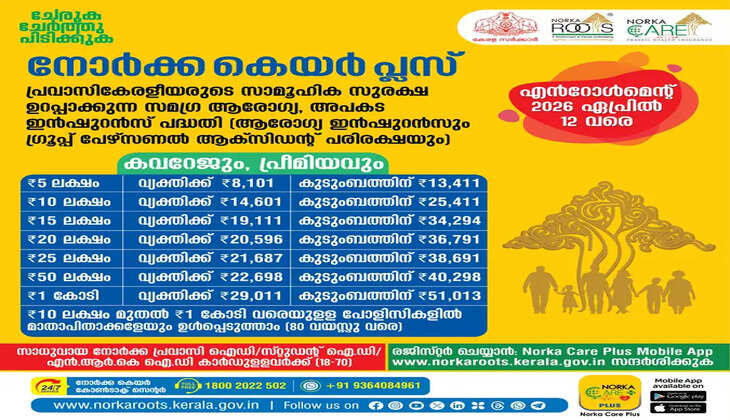 പ്രവാസികേരളീയർക്കായി നോർക്ക റൂട്ട്സ് നടപ്പിലാക്കുന്ന സമഗ്ര ആരോഗ്യ-അപകട ഇൻഷുറൻസ് പദ്ധതിയായ 'നോർക്ക കെയർ പ്ലസ്' രണ്ടാം ഘട്ട എൻറോൾമെന്റ് ആരംഭിച്ചു. പരിഷ്കരിച്ച ഈ പദ്ധതിയിൽ 2026 ഏപ്രിൽ 12 വരെ പ്രവാസികൾക്ക് അംഗങ്ങളാകാം. 18 മുതൽ 70 വയസ്സുവരെയുള്ള, സാധുവായ നോർക്ക പ്രവാസി ഐഡിയോ സ്റ്റുഡന്റ് ഐഡിയോ ഉള്ളവർക്കാണ് ഈ ആനുകൂല്യം ലഭിക്കുക.