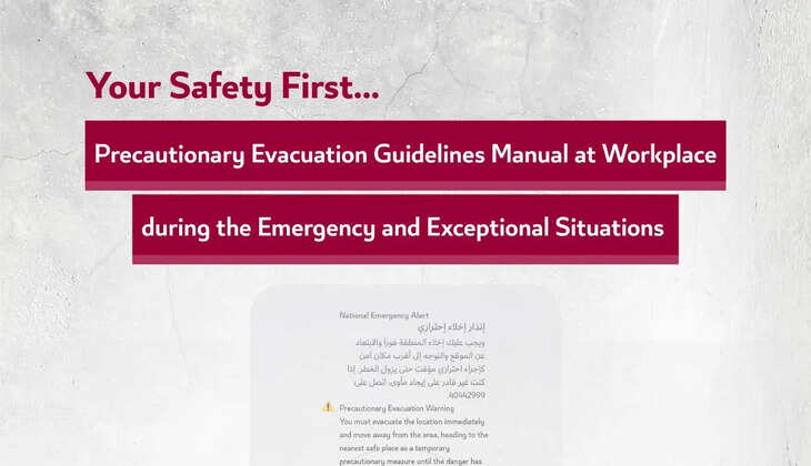 സുരക്ഷാ സൈറണുകളോ അറിയിപ്പുകളോ ലഭിച്ചാൽ ഉടൻ ജോലി നിർത്തിവെച്ച് ശാന്തത പാലിക്കണം. നിശ്ചയിച്ചിട്ടുള്ള എവാക്വേഷൻ പാതകളിലൂടെ സുരക്ഷിതമായി പുറത്തിറങ്ങണം. സഹപ്രവർത്തകരെയും സന്ദർശകരെയും സഹായിക്കാൻ ശ്രദ്ധിക്കണം; പ്രത്യേകിച്ച് മുതിർന്ന പൗരന്മാർക്കും ഭിന്നശേഷിക്കാർക്കും മുൻഗണന നൽകണം. ഓടുകയോ തള്ളുകയോ ചെയ്യാതെ ശാന്തമായി നീങ്ങണം. ഇത്തരം സാഹചര്യങ്ങളിൽ ലിഫ്റ്റുകൾ ഒരു കാരണവശാലും ഉപയോഗിക്കരുത്.