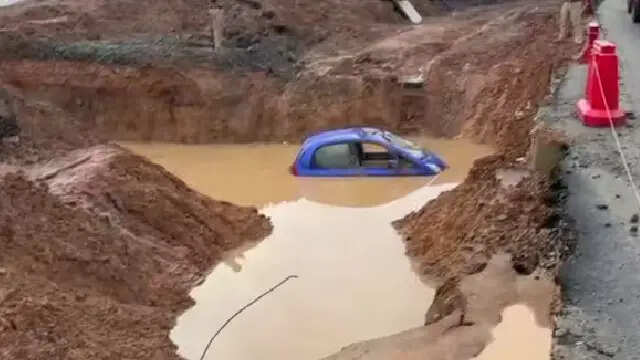 ദേശീയപാതയിൽ കാറപകടം: നിർമാണത്തിനെടുത്ത കുഴിയിലേക്ക് കാർ മറിഞ്ഞ് വീണ് അത്ഭുതകരമായ രക്ഷ