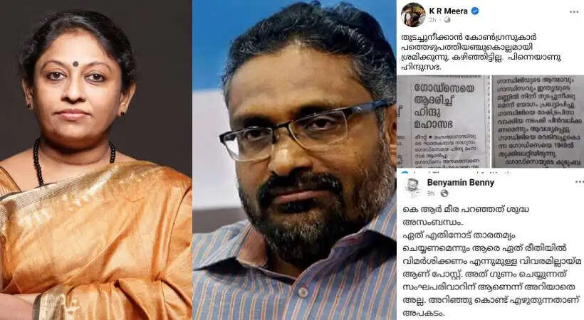 ‘ഗോഡ്സെയെ ആദരിച്ച് ഹിന്ദു മഹാസഭ’ എന്ന വാർത്തയുടെ ചിത്രം ‘തുടച്ചുനീക്കാൻ കോൺഗ്രസുകാർ പത്തെഴുപത്തിയഞ്ചുകൊല്ലമായി ശ്രമിക്കുന്നു. കഴിഞ്ഞിട്ടില്ല. പിന്നെയാണു ഹിന്ദുസഭ’ എന്ന കുറിപ്പോടെയാണ് മീര പങ്കുവെച്ചത്. ഇതിനെതിരെ രൂക്ഷവിമർശനവുമായി ബെന്യാമിൻ അടക്കമുള്ളവർ രംഗത്തെത്തിയിരുന്നു. ബെന്യാമിന്റെ വിമർശനങ്ങളോട് രൂക്ഷമായ രീതിയിൽ പ്രതികരിച്ച് കെ.ആർ മീര വീണ്ടും രംഗത്തെത്തി.