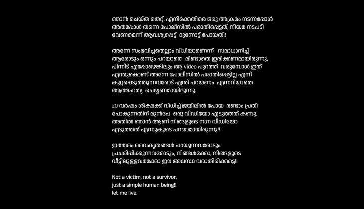 ആത്മഹത്യ ചെയ്യണമായിരുന്നു, പരാതിപ്പെട്ടത് എന്റെ തെറ്റ്; വൈകാരിക കുറിപ്പുമായി അതിജീവിത