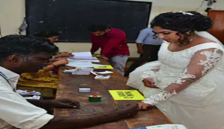 ചടങ്ങുകൾക്ക് മുമ്പ് വിവാഹവസ്ത്രത്തിൽ വോട്ട് ചെയ്യാനെത്തി വധു