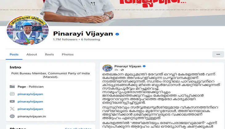 തെലങ്കാന മുഖ്യമന്ത്രി രേവന്ത് റെഡ്ഡി കേരളത്തിൽ വന്ന് കേരളത്തെ അവഹേളിക്കുന്ന പ്രസ്താവനകളാണ് നടത്തിയിരിക്കുന്നത്. സ്വന്തം നാട്ടിലെ പാവപ്പെട്ടവന്റെ കിടപ്പാടങ്ങൾക്കു മീതെ ബുൾഡോസർ കയറ്റിയിറക്കുന്നത് സൗകര്യപൂർവ്വം മറച്ചുവെച്ച് സാമൂഹിക പുരോഗതിയെക്കുറിച്ചും ജനക്ഷേമത്തെക്കുറിച്ചും കേരളത്തെ പഠിപ്പിക്കാൻ തയ്യാറാവുന്ന അദ്ദേഹത്തെ ആരോ കാര്യമായി തെറ്റിദ്ധരിപ്പിച്ചിട്ടുണ്ട്. സുസ്ഥിരവും സർവ്വതലസ്പർശിയുമായ വികസനത്തിന്റെ വഴിയിലൂടെ കേരളം മുന്നേറുമ്പോൾ, അതിനെയാകെ അട്ടിമറിക്കാൻ ശ്രമിക്കുന്നവരുടെ വക്കാലത്താണ് അദ്ദേഹം ഏറ്റെടുത്തിട്ടുള്ളത്.