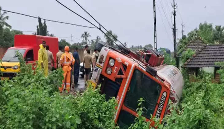 കാഞ്ഞങ്ങാട് ജനങ്ങളെ ഒഴിപ്പിക്കുന്നു; മറിഞ്ഞ എൽപിജി ടാങ്കർ ഉയർത്തുന്നതിനിടെ വാൽവ് പൊട്ടി വാതകം ചോരുന്നു