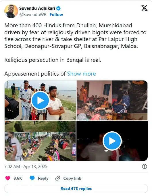 മുർഷിദാബാദ് സംഘർഷം: ഹിന്ദുക്കൾ പലായനം ചെയ്യുന്നുവെന്ന ആരോപണവുമായി ബിജെപി