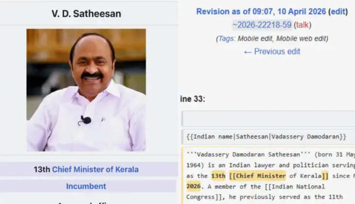 നിയമസഭ തെരഞ്ഞെടുപ്പ് വോട്ടിംഗ് പൂര്ത്തിയായതിന് പിന്നാലെ പ്രതിപക്ഷ നേതാവ് വി ഡി സതീശന്റെ വിക്കിപീഡിയ പേജ് ആരോ എഡിറ്റ് ചെയ്തു. വി ഡി സതീശനെ കേരളത്തിന്റെ 13-ാം മുഖ്യമന്ത്രിയാക്കി കൊണ്ടായിരിരുന്നു ആദ്യ എഡിറ്റിംഗ്. 2026 മേയ് നാലിന് ചുമതലയേറ്റതെന്നും എഡിറ്റ് ഹിസ്റ്ററിയിൽ നിന്നുള്ള വിവരങ്ങൾ വ്യക്തമാക്കുന്നു. പിന്നാലെ അദ്ദേഹത്തിന്റെ പേജിൽ വീണ്ടും എഡിറ്റിംഗ് ചെയ്തിട്ടുണ്ട്. ഇപ്പോൾ പരിശോധിച്ചാൽ വി ഡി സതീശൻ പ്രതിപക്ഷ നേതാവ് എന്നാണ് രേഖപ്പെടുത്തിയിട്ടുള്ളത്. പക്ഷേ ചുമതയേറ്റ ദിനം 2026 മേയ് നാല് എന്ന് തന്നെയാണുള്ളത്.