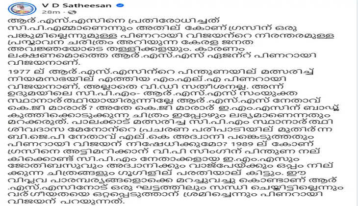ആര്എസ്എസ് നടത്തിയ ഗോള്വാള്ക്കര് ജന്മശതാബ്ദി ആഘോഷ ചടങ്ങ് ഉദ്ഘാടനം ചെയ്യുന്ന ചിത്രം സഹിതം മുഖ്യമന്ത്രി പിണറായി വിജയന് നടത്തിയ വിമര്ശനത്തിന് പ്രതികരണവുമായി പ്രതിപക്ഷ നേതാവ് വിഡി സതീശന്. ലക്ഷണമൊത്ത ആര്എസ്എസ് ഏജന്റാണ് പിണറായി വിജയന്. ആര്എസ്എസിനെ പ്രതിരോധിച്ചത് സിപിഎമ്മാണെന്നും അതില് കോണ്ഗ്രസിന് ഒരു പങ്കുമില്ലെന്നുമുള്ള പിണറായി വിജയന്റെ പ്രസ്താവന ചരിത്രം അറിയുന്ന കേരള ജനത അവജ്ഞയോടെ തള്ളിക്കളയുമെന്നും വിഡി സതീശന് ഫെയ്സ്ബുക്ക് കുറിപ്പില് പറഞ്ഞു.1977 ല് ആര്എസ്എസിന്റെ പിന്തുണയില് മത്സരിച്ച് നിയമസഭയില് എത്തിയ എംഎല്എ പിണറായി വിജയനാണ്, അല്ലാതെ വിഡി സതീശനല്ല. അന്ന് ഉദുമയിലെ സിപിഎം- ആര്എസ്എസ് സംയുക്ത സ്ഥാനാര്ത്ഥിയായിരുന്നില്ലേ ആര്എസ്എസ് നേതാവ് കെജി മാരാര്?. അതേ കെ ജി മാരാര് ഇഎംഎസിന് ബാഡ്ജ് കുത്തിക്കൊടുക്കുന്ന ചിത്രം ഇപ്പോഴും ലഭ്യമാണെന്നതും മറക്കരുത്. പാലക്കാട് മത്സരിച്ച സി.പി.എം സ്ഥാനാര്ത്ഥി ശിവദാസ മേനോന്റെ പ്രചരണ പരിപാടിയില് മുതിര്ന്ന ബിജെപി നേതാവ് എല്കെ അഡ്വാനി പങ്കെടുത്തതും പിണറായി വിജയന് നിഷേധിക്കുമോയെന്ന് വിഡി സതീശന് ചോദിച്ചു.